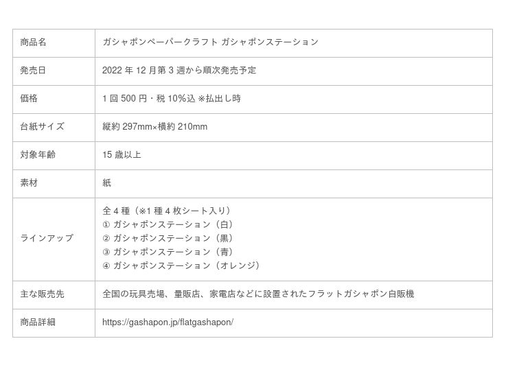 このたび、本プロジェクトの取り組みの一環として、ガシャポン自販機「ガシャポンステーション」が初めてペーパークラ フトになった『ガシャポンペーパークラフト ガシャポンステーション』(1 回 500 円・税 10%込、全 4 種)を、12 月第 3 週 から順次、全国の玩具売り場、量販店、家電店などに設置されたフラットガシャポン自販機にて発売します。