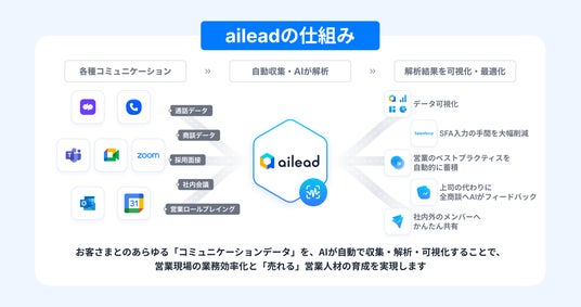 商談・面談データ解析クラウド ailead(エーアイリード)は、“営業・人事部長の右腕”として、業務効率化と人材育成を通じた生産性向上を支援するツールです。