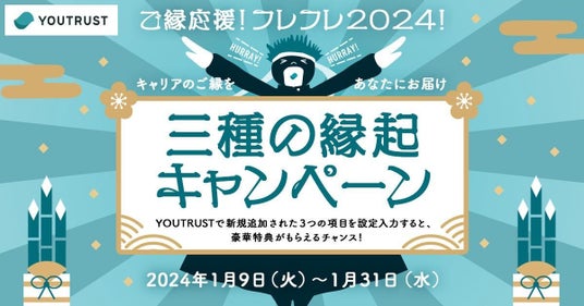 2024年新たなキャリアに出会っていただくために、YOUTRUSTのプロフィールを充実させる「三種の縁起キャンペーン」を実施。2024年からYOUTRUST上で新たに「生年月日」「希望の働く場所」「希望の働き方」の3項目が追加になり、よりユーザー様にマッチしたキャリアに出会っていただくことが出来るようになりました。