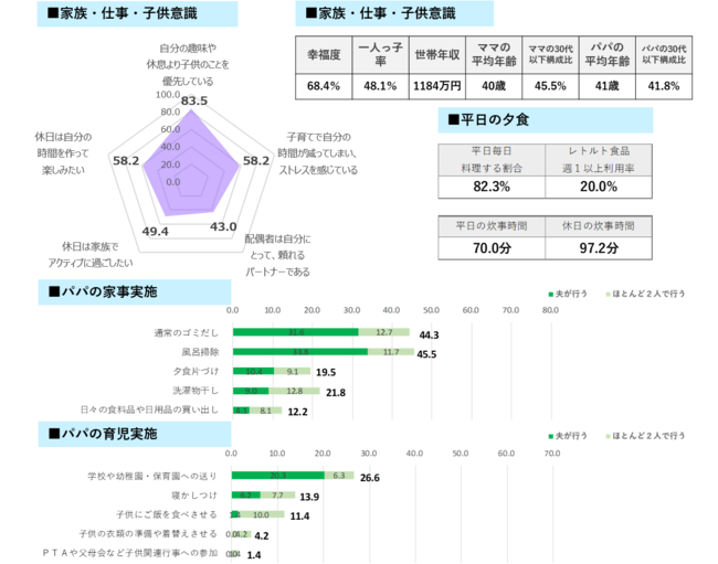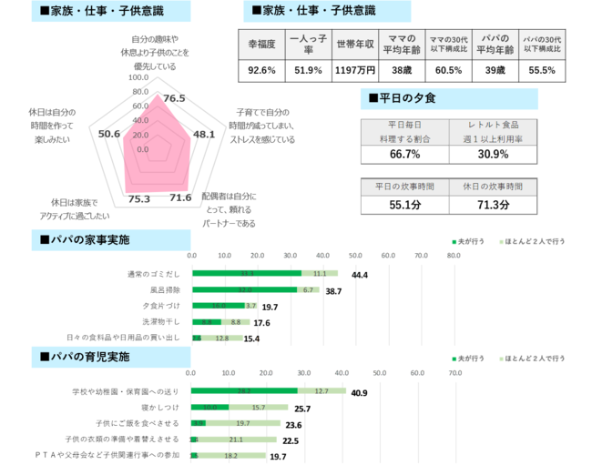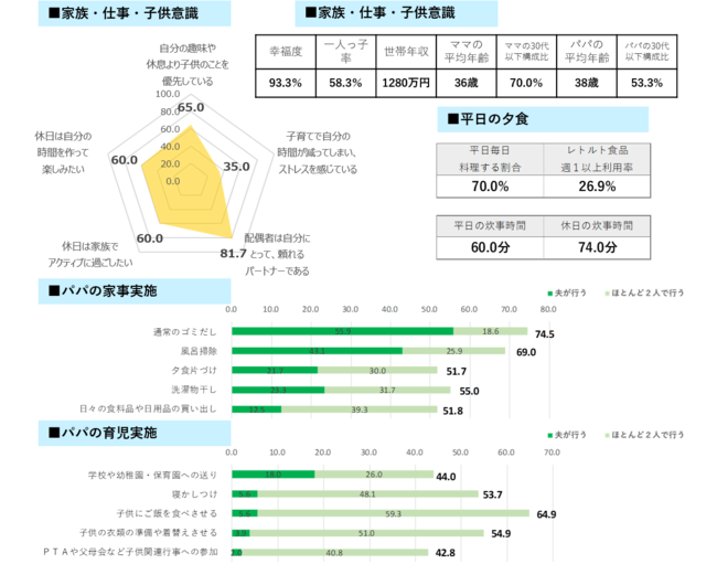 「休日は家族でアクティブに過ごしたい」という意識も75.3%と高く、家族で一緒に過ごす時間を大切にしていることも特徴です。家族円満の背景には、ママの効率的な実行力と、パパの“縁の下の力持ち”サポートがあるようです。