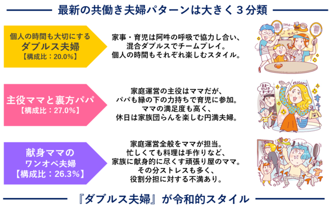 しかし、コロナ禍を経てパパの家事・育児参加率も増加傾向になり、その中でも従来は実施率が低めだった育児にもパパが積極的に参加する共働き夫婦が、比較的若い層に見受けられるようになりました。今回の3分類の「ダブルス夫婦」がこれにあたります。