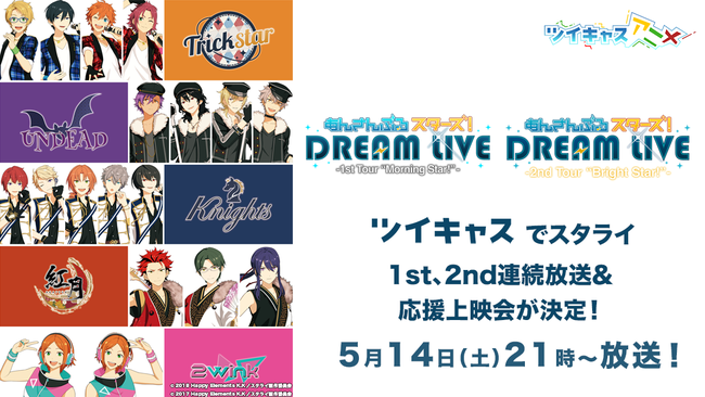 今回、ツイキャスアニメではスタライの中から「あんさんぶるスターズ!DREAM LIVE -1st Tour “Morning Star!”- 東京追加公演ノーカット版」、「あんさんぶるスターズ!DREAM LIVE - 2nd Tour “Bright Star!”- 大阪公演ノーカット版」を2本続けて上映いたします。ライブに参戦したことのある方はもちろん、スタライを初めて見るという方もこの機会にぜひ、お楽しみいただければと思います。