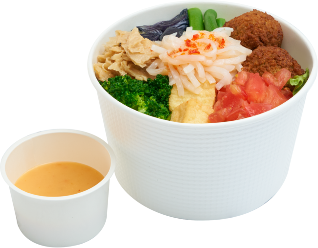 枝豆とひよこ豆に香辛料を混ぜ合わせた中東風のコロッケ、ファラフェルに、チキン風の大豆ミートにさっぱり味付けをしたサラダチキン。スイートチリソースと絡み合うフォーで食べ応え十分。