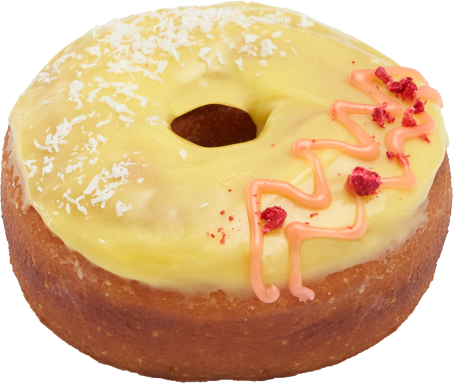 マンゴー、パッションフルーツ、パインを使用したトロピカルなグレーズに、ラム酒を合わせた南国テイストのカクテルをイメージした夏季限定ドーナツ。一口食べるとフルーツの爽やかな酸味とココナッツの香りが広がり、波の音が聞こえてきそうな楽しい気分に。トロピカルラズベリーのピンクカラーでキュートに仕上げました。