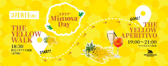 3月8日は、イタリアでは、男性が女性に美しいミモザの花を贈り、女性の社会での活躍を祝福しています。在日イタリア商工会議所は、女性のエンパワーメントを促進するために、このすてきなイタリアの文化習慣を日本に広める活動として、「Mimosa Day(ミモザ デイ)」というイベント事業を推進しています。そのイベントの一環として、「THE YELLOW WALK&THE YELLOW APERITIVO」をミモザの当日、3月8日開催致します。