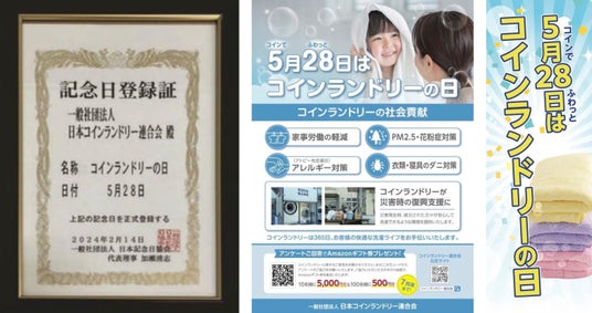 アクア株式会社(本社:東京都中央区、代表取締役社長 兼 CEO:杜 鏡国)が特別賛助会員として活動を支援する、一般社団法人 日本コインランドリー連合会(東京都文京区、理事長 宮澤敏文)は、5月28日を「コインランドリーの日」として2023年11月29日に一般社団法人日本記念日協会に登録申請を行い、2024年2月14日に登録が認められました。