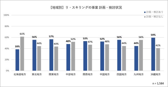 地域別に見た場合、リ・スキリング事業を企画・検討の状況が、特別に際立って多いあるいは少ない地域はなく、【図1】の全国の自治体の傾向と同様に、それぞれの地域において、約半数の自治体が企画あるいは検討している状況であることが見えてきました。【図3参照】