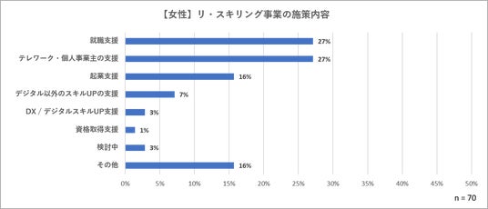 一方で、対象を明確に「女性」としている自治体の具体的な施策内容を見てみると、「就職支援」と、「テレワーク・個人事業主の支援」がそれぞれ27%と最も多く、次に「起業支援(16%)」が続きました。【図6参照】