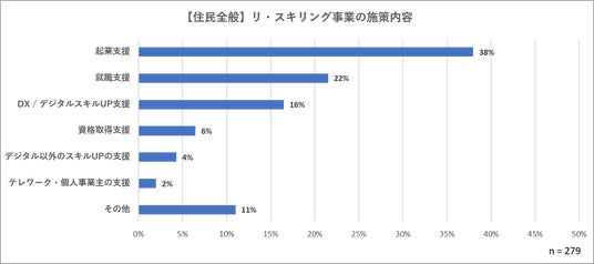 「住民全般」を対象にしたリ・スキリング事業を計画または検討している279自治体に、具体的な施策内容を尋ねたところ、「起業支援(38%)」が最も多く、「就職支援(22%)」が続きました。【図5参照】