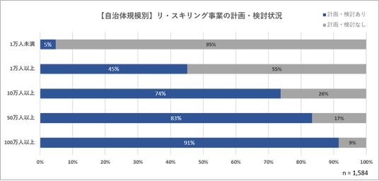 自治体の人口規模別に見ると、人口100万人以上では90%以上、50万人以上では80%以上、10万人以上では70%以上なのに対し、人口1万人未満の自治体では、わずか5%にとどまりました。人口規模が大きいほど、リ・スキリング事業を企画あるいは検討している自治体が多いことが分かりました。【図2参照】