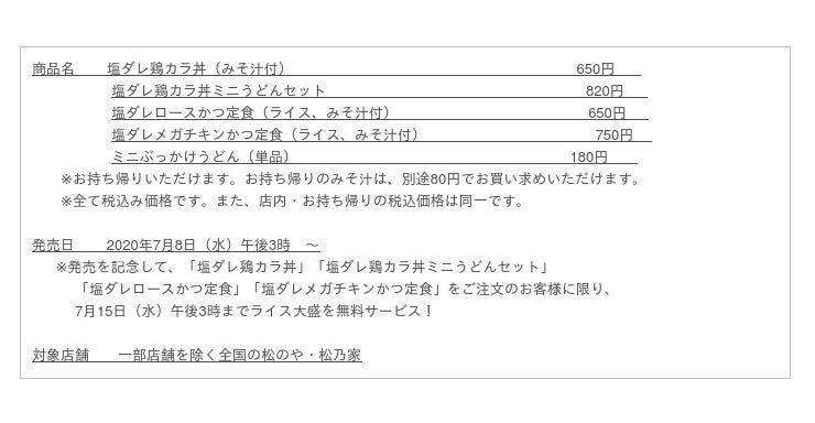 このたび松屋フーズ(本社:東京都武蔵野市、代表取締役社長:瓦葺一利)では、とんかつ専門店の「松のや・松乃家」におきまして、2020年7月8日(水)午後3時から、「塩ダレ鶏カラ丼」「塩ダレかつ定食」を新発売いたします。