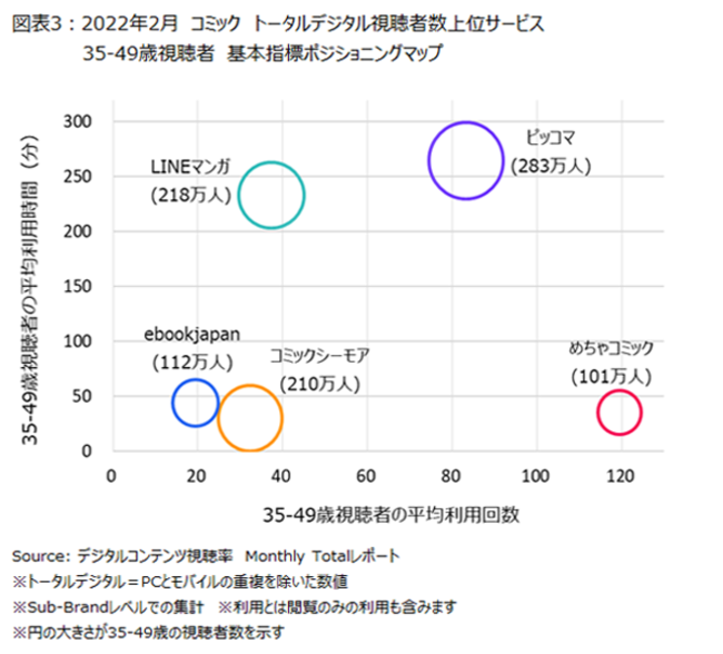 - 35-49歳の視聴者は、「めちゃコミック」を最も頻繁に利用しており、月平均100回以上利用