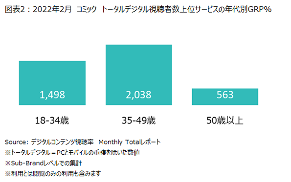 次に、「コミック」ジャンルにおける視聴者数上位5サービスを合計したターゲットGRP(TARP)を年代別に見ると、35-49歳で最も高く2,038%となっていました。次いで18-34歳で1,498%となっていました(図表2)。