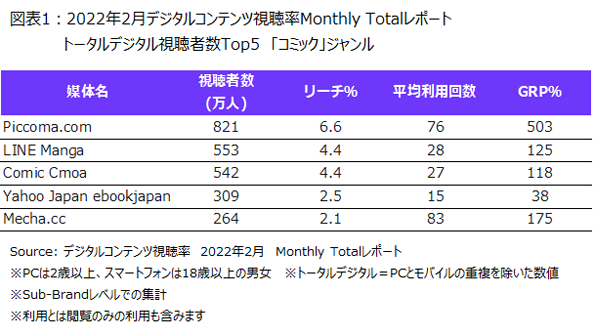 2022年2月のMonthly Totalレポートによると、「コミック」ジャンルにおいて、PCとモバイルの重複を除いたトータルデジタルで、最も視聴者数(2歳以上)が多かったのは「ピッコマ(Piccoma.com)」で821万人が利用しており、「LINEマンガ(LINE Manga)」が553万人で続いていました。一方、月間平均利用回数では「めちゃコミック(Mecha.cc)」が月平均83回と最も多くなっていました(図表1)。