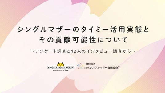 一般社団法人日本シングルマザー支援協会(所在地:神奈川県横浜市、代表理事:江成 道子)(以下、協会)はスキマバイトサービス「タイミー」を提供する株式会社タイミー(所在地:東京都港区、代表取締役:小川 嶺)(以下、タイミー社)と協働で、シングルマザーのタイミー利用実態の把握と、就労支援上の貢献可能性の可視化を目的とした調査を実施しました。