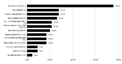 また同設問に対して、「アピールできる職歴・経験が不足している」(21.5%)、「自分の年齢に合う仕事がない」(20.0%)、「勤務先の労働条件が合っていない」(16.9%)、「やってみたいと思える仕事がない」(9.2%)など、求人とのミスマッチと言える課題も散見されました。協会のひとり親コンシェルジュからは、これまでの支援事例の中にも「世の中にどのような仕事があるか知らない」、「求人は色々あるが、実際の業務内容のイメージが湧かず、一歩踏み出せない」といった方が多いとの意見が聞かれました。