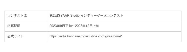 第1回に引き続き、『TOKYO INDIE GAMES SUMMIT 2024』の会期中に、株式会社バンダイナムコエンターテインメントと株式会社バンダイナムコスタジオが主催する「第2回GYAAR Studio インディーゲームコンテスト」の受賞作品の発表が決定!コンテストの詳細は、コンテスト公式サイトをご確認ください。