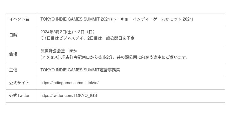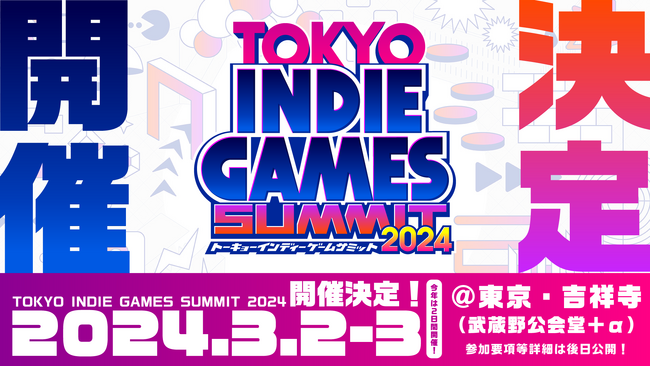 株式会社Phoenixx(フィーニックス)(東京都武蔵野市、代表取締役社長:坂本 和則)は、2回目の開催を迎えるインディーゲームのためのイベント『TOKYO INDIE GAMES SUMMIT 2024』(トーキョーインディーゲームサミット 2024)を、来年2024年3月2日(土)~3日(日)に武蔵野公会堂(吉祥寺)で開催決定いたしましたことをお知らせいたします。
