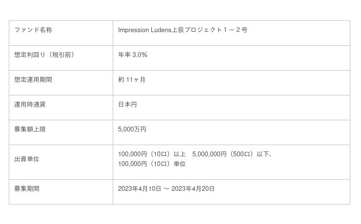 本ファンドは、投資家の皆様からの出資金を、『株式会社アエリア(東証スタンダード市場上場)』の子会社である『株式会社Impression(インプレッション)』に対し、不動産開発資金(土地購入代金)として貸付け運用するファンドです。