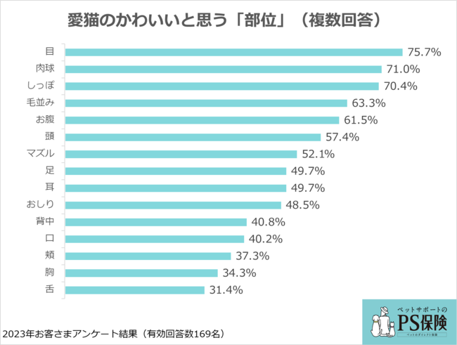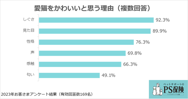 ペット保険の「PS保険」を提供する少額短期保険会社のペットメディカルサポート株式会社(本社:東京都港区赤坂、代表取締役社長:米満 明仁、以下『ペットメディカルサポート』)は、2月22日の「猫の日」にちなみ、当社ペット保険「PS保険」のご契約者さまで猫を飼われている方1,003名(有効回答数169名)を対象に、愛猫のかわいらしさに関するアンケート調査を行いました。