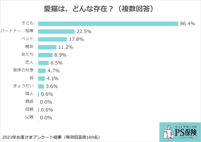 飼い主にとって愛猫の存在1位は、「子ども」(86.4%)で、2位以下に圧倒的な差を付けました。続く2位は「パートナー、相棒」(22.5%)と、愛猫は飼い主にとって非常に近しい間柄であることがわかりました。