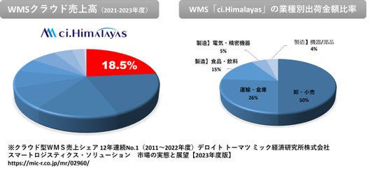 「ci.Himalayas」は、入庫、出庫、在庫、棚卸、請求など、倉庫管理に必要な210以上の機能を備えたクラウド型倉庫管理システムです。本調査ではクラウド型WMS市場で18.1%のシェアを誇り、2011年度から13年連続でNo.1を維持しています。また、利用料シェアでは20.1%で1位、保守サポートでは2位を記録し、業界別では食品・飲料、卸売、小売、機器部品の各分野で高いシェアを獲得しています。