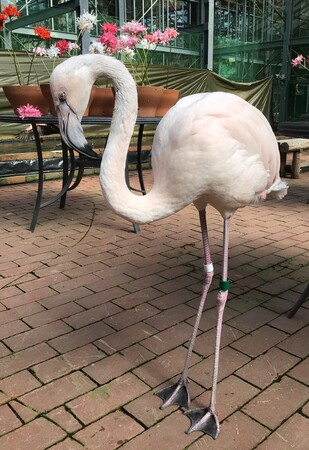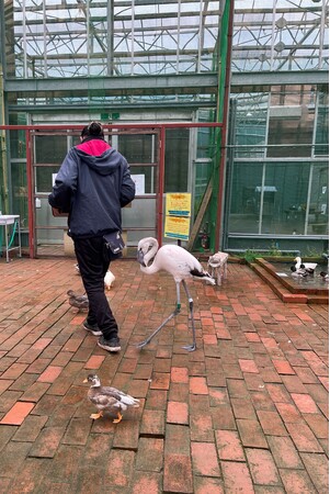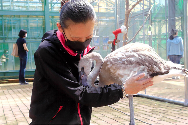 ・当園で初めて、試行錯誤しながらも人の手で無事に育ってくれたフラミンゴです。他の同年代のフラミンゴはフラミンゴプールのフラミンゴ達が大切に育てた子供達です。つゆちゃんの名前の由来は、生まれたのが2021年5月18日火曜日の朝、梅雨の時期に生まれた事から“つゆ”と名付けました。