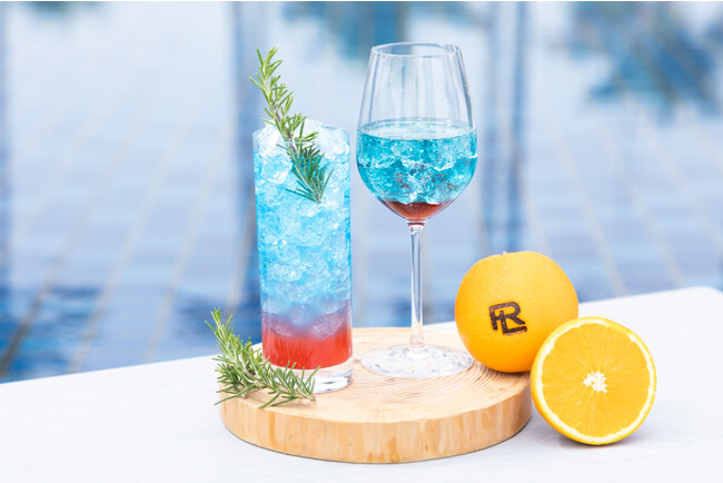 ザクロシロップをベースに、ブルーキュラソーで色づけした炭酸とレモンジュースで清涼感ある仕上がりに。リビエラ逗子マリーナの象徴『椰子の木』に見立て自家製ローズマリーを添えて、深みのある香りがスパイスになっています。