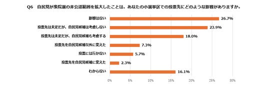 今回の非公認範囲の拡大が自身の小選挙区での投票先選びに影響はないとした人が26.7%で、「投票先は未定だが、自民候補は(投票先として)考慮しない」が23.9%、「投票先は未定だが、自民候補も考慮する」が18.0%などとなった。