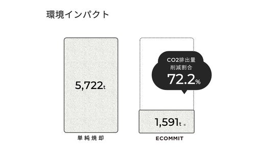 さらに、ECOMMITが回収・選別した衣類を資源循環した際に発生するCO2に、ECOMMITの事業活動により生じるscope1及びscope2 (※2)に関連するCO2を加えたCO2排出量は約 1,591トンとなり、単純焼却のCO2排出量(約5,722トン)と比較して、72.2%のCO2排出量を削減できています。