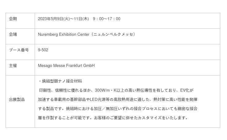 トーヨーケムは、今後ますます需要が増加する車載用パワーデバイス向けに、独自の粒子設計技術や分散技術を用いた焼結型銀ナノ接合材料の提案を行います。本開発品は、高い熱電導性を有しているため熱対策に有効であり、現在国内の自動車関連やLED光源の放熱用部材向けに評価が進んでおります。今回の海外出展を通して、EV化の進む欧米市場への提案を加速させてまいります。