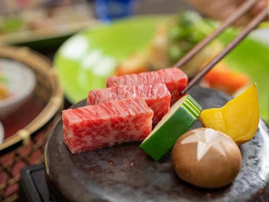 夕食はブランド牛の山形牛を使用した和食膳。すき焼きメインの「山形牛のすき焼きプラン」、またはステーキメインの「至福の山形牛ステーキプラン」の2つのコースから選べます。
