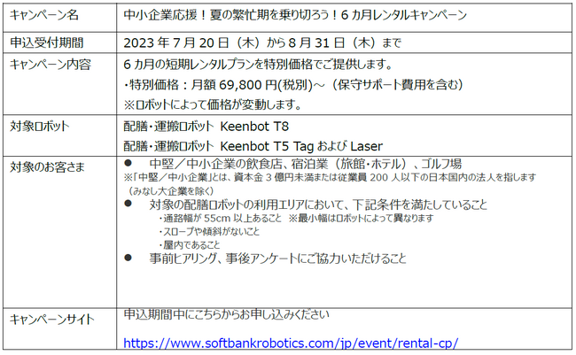 ソフトバンクロボティクス株式会社(本社:東京都港区、代表取締役社長 兼 CEO:冨澤 文秀)は、「中小企業応援!夏の繁忙期を乗り切ろう!6カ月レンタルキャンペーン」を実施しており、2023年7月20日から2023年8月31日までお申し込みを受け付けています。当キャンペーンでは、通常3年または5年の契約期間のところを、特別価格で6カ月間ご利用いただけます。