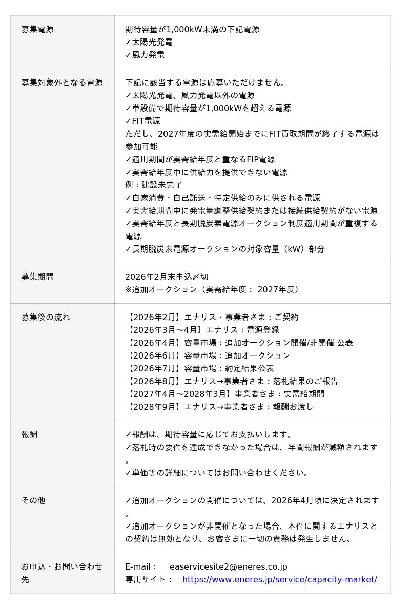 株式会社エナリス(本社:東京都千代田区、代表取締役社長:都築実宏)は、容量市場変動電源(アグリゲート)追加オークションに、当社のアグリゲーションを通して参加する事業者さまを募集します。