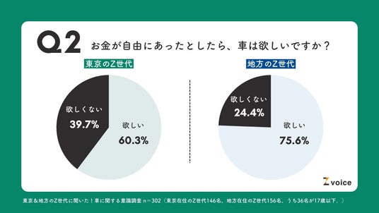 次に、「お金が自由にあったとしたら、車は欲しいですか?」という質問に対しては、「欲しい」と回答したのが東京のZ世代で60.3%、地方のZ世代で75.6%という結果に。