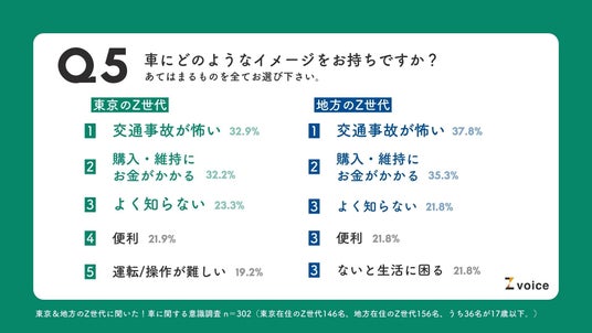 最後に、車に関するイメージを尋ねてみたところ、東京・地方ともに第1位は「交通事故が怖い」。続いて、「購入・維持にお金がかかる」「よく知らない」などの回答が並びました。