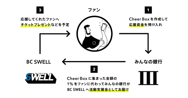 「BCS」(BC SWELLの略称)の3文字を含む名前を付けたCheer Boxにお金を預けていただくことで、みんなの銀行がファンの皆さまに代わって、Cheer Box預金残高の1%を「BC SWELL」にお届けします。