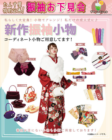 レンタル上がりの希少な振袖や、新作振袖小物の展示販売イベントです。