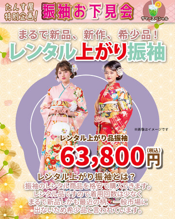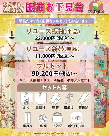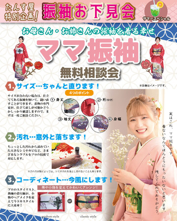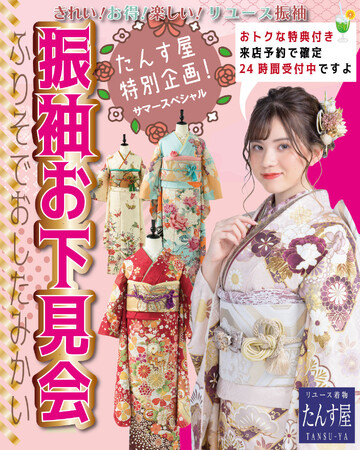 リユース着物の「たんす屋」は2023年4月末から6月にかけて、全国4か所の実店舗で、「振袖お下見会」を開催いたします。レンタル上がりの希少な振袖や、新作振袖小物の展示販売、お母様やお姉さまの振袖を有効利用する「ママ振袖無料相談会」など盛りだくさんの内容となっております。来年・再来年に振袖を着たいと思っている方は、ぜひおいでください。