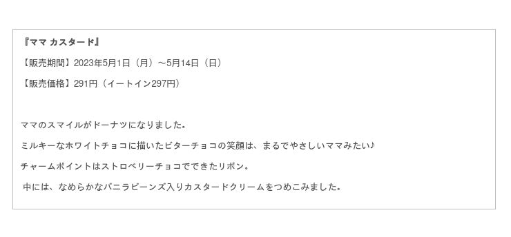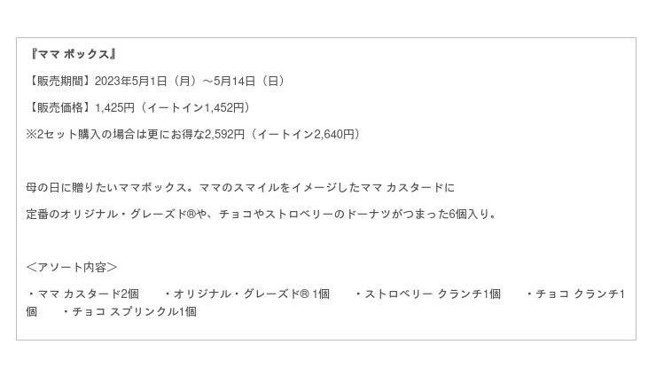 クリスピー・クリーム・ドーナツ・ジャパン株式会社(本社:東京都渋谷区、代表取締役社長:若月貴子、以下:KKDJ)は、5月14日(日)に迎える母の日に向けて、『ママ カスタード』を2023年5月1日(月)~5月14日(日)の期間限定でクリスピー・クリーム・ドーナツ店舗※1にて販売します。また、『ママ カスタード』と人気の定番商品をセットにしたお得な『ママ ボックス』も販売します。