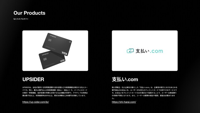 当社は、「挑戦者を支える世界的な金融プラットフォームを創る」をミッションに、法人カード「UPSIDER」およびビジネスあと払いサービス「支払い.com」を提供しており、両サービスの利用社数は25,000社を超えています。