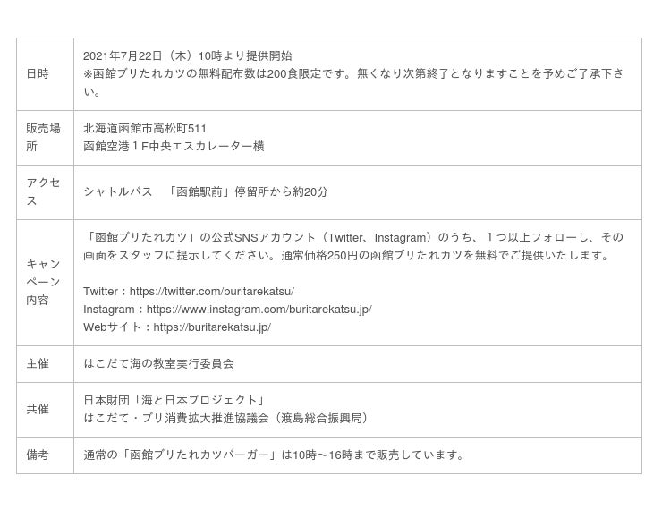 はこだて海の教室実行委員会は、7月22日海の日限定のキャンペーンとして、函館ブリたれカツの公式SNSアカウント(Twitter、Instagram)のうち、1つ以上フォローしてくださった方には、函館ブリたれカツ(単品)を無料提供いたします。このキャンペーンは、はこだて・ブリ消費拡大推進協議会からブリの無償提供を受け実現しています。