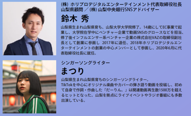 本イベントでは、山梨県出身で現在活躍中の先輩や同世代のインフルエンサーをゲストスピーカーにお迎えし、2人から見た山梨の良いところや悪いところ、思い出の写真を披露しながらの山梨の思い出や、ターニングポイントとなったできごとなどを、エピソードを交えつつ紹介いただくとともに、学生の頃感じていた不安や葛藤と、それらとの向き合い方なども語っていただきます。