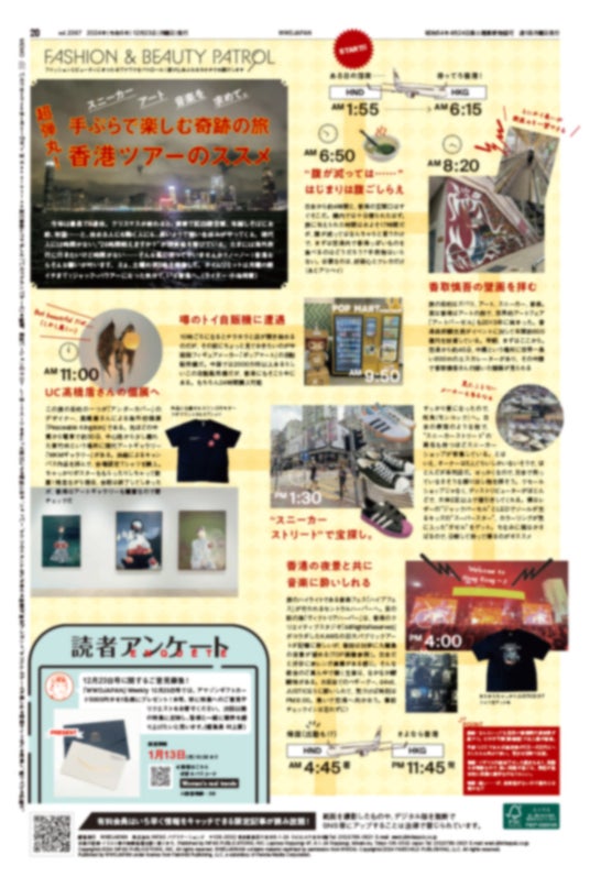 巻末人気企画「ファッション&ビューティパトロール」はライター小池氏による香港弾丸旅行記。高橋盾「アンダーカバー(UNDERCOVER)」デザイナーの個展、香取慎吾の壁画との出合い、スニーカーストリートでの宝探し......。年末年始は家でのんびりしようと思っていたあなたも、香港に行ってみたくなるかも?