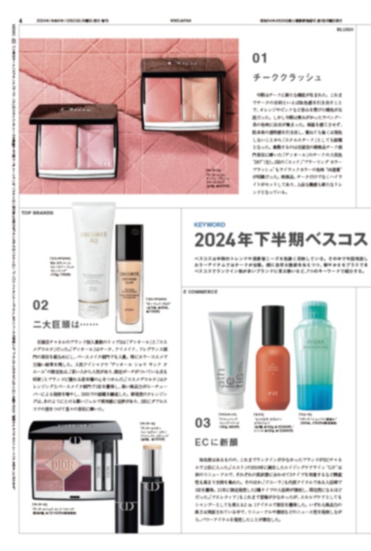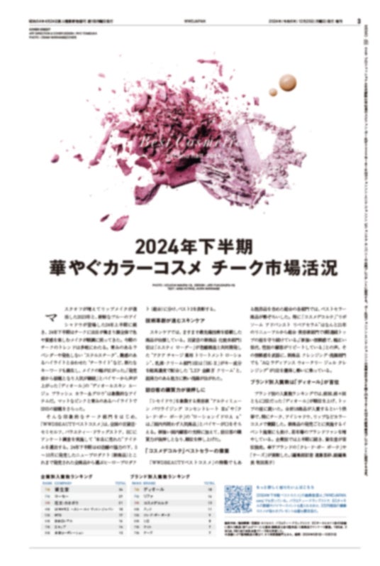 そんな印象的なチーク部門をはじめ、「WWDBEAUTYベストコスメ」は、全国の百貨店・セミセルフ、バラエティー・ドラッグストア、ECにアンケート調査を実施して“本当に売れた”アイテムを選出しました。24年下半期は43店舗の協力の下、5~10月に発売したニュープロダクト(新商品)とこれまで発売された全商品から選ぶヒーロープロダクト(総合)に分け、ベスト3を発表します。今期を総括した保存版としてぜひチェックしてみてください。