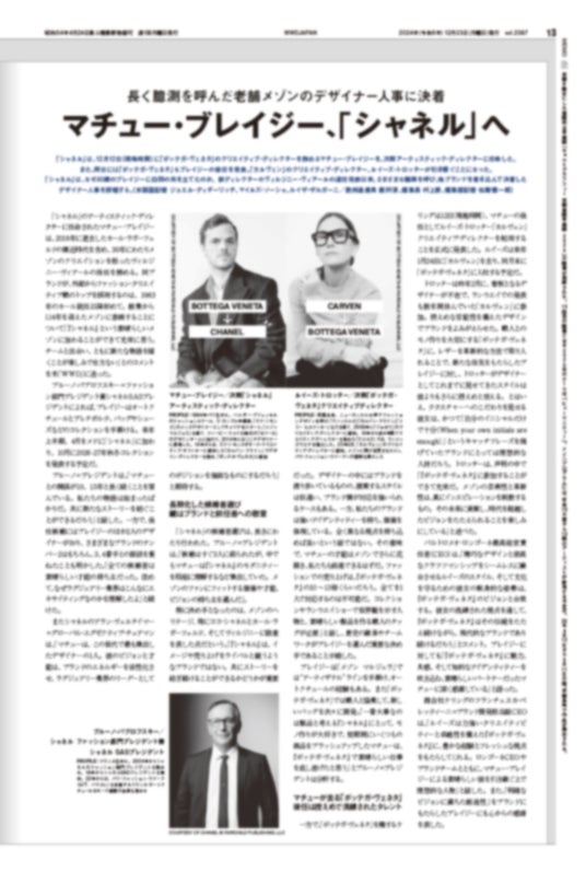 そのほか、12月12日に「シャネル(CHANEL)」が次期アーティスティック・ディレクターに現「ボッテガ・ヴェネタ(BOTTEGA VENETA)」クリエイティブディレクターのマチュー・ブレイジーを任命したニュースをピックアップ。さまざまな憶測を呼びながら決着したデザイナー人事の背景を米「WWD」記者の見解とともに詳報します。