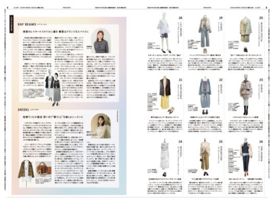 本特集では、ブランドの企画担当者や販売員が気になるであろう、2025年春夏の国内リアルクローズ市場を戦う「5つのカギ」をQ&A形式で紹介。国内ウィメンズリアルクローズ市場の有力35業態の打ち出しを一挙に紹介します。加えて、ユニークな提案や商品戦略が際立った「スナイデル(SNIDEL)」「レイ ビームス(RAY BEAMS)」「カレンソロジー(CURENSOLOGY)」「サードマガジン(THIRD MAGAZINE)」のディレクターや企画責任者へのインタビューも収録しています。