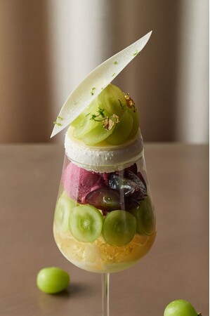 皮ごと食べられる芳醇な甘さの巨峰に、上品な香りと爽やかな甘さが特徴のシャインマスカットを贅沢に詰め込んだ、2種類のブドウを一度に味わえるパフェが登場します。