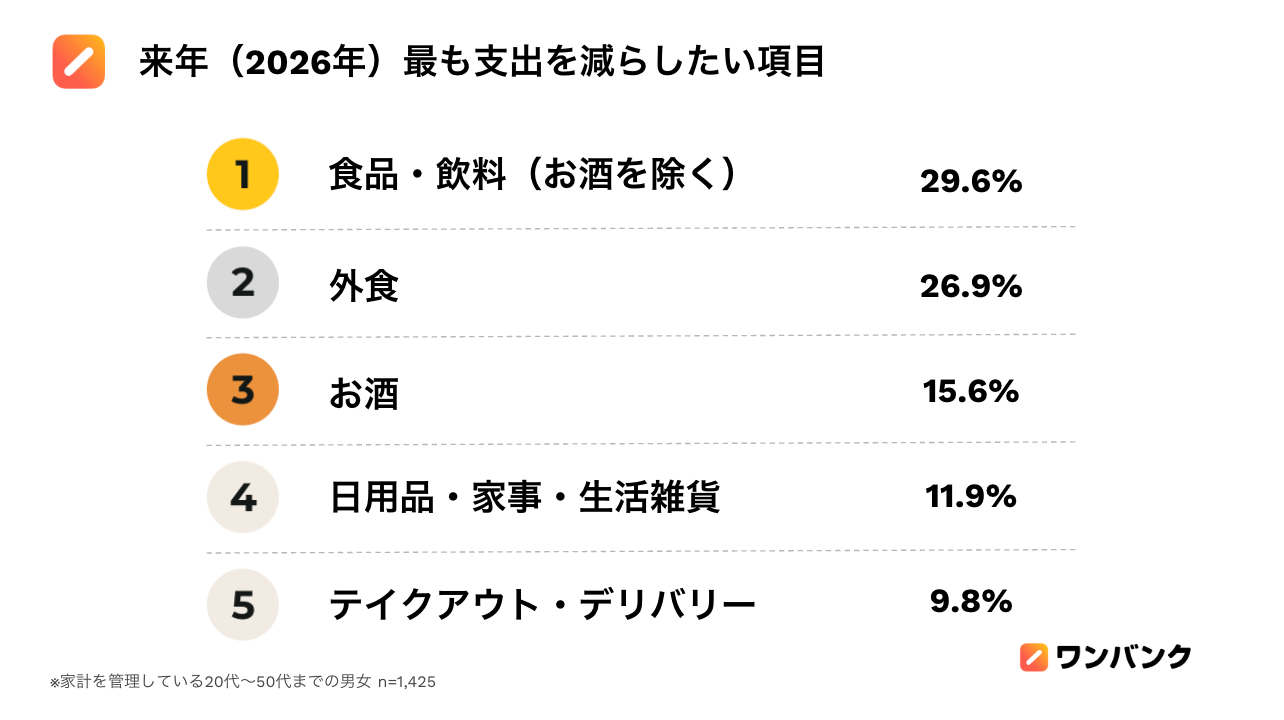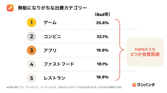 AI家計簿アプリ「ワンバンク」広報事務局は、家計を管理している方1,425名を対象に実施した「2025年の“無駄遣い”に関する調査」と、AI家計簿アプリ「ワンバンク」ユーザーの2025年の支出を分析しました。これらの結果を踏まえ、2025年の支出実態に関するニュースレターをお届けします。