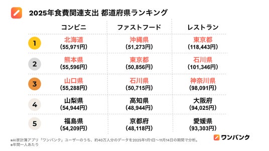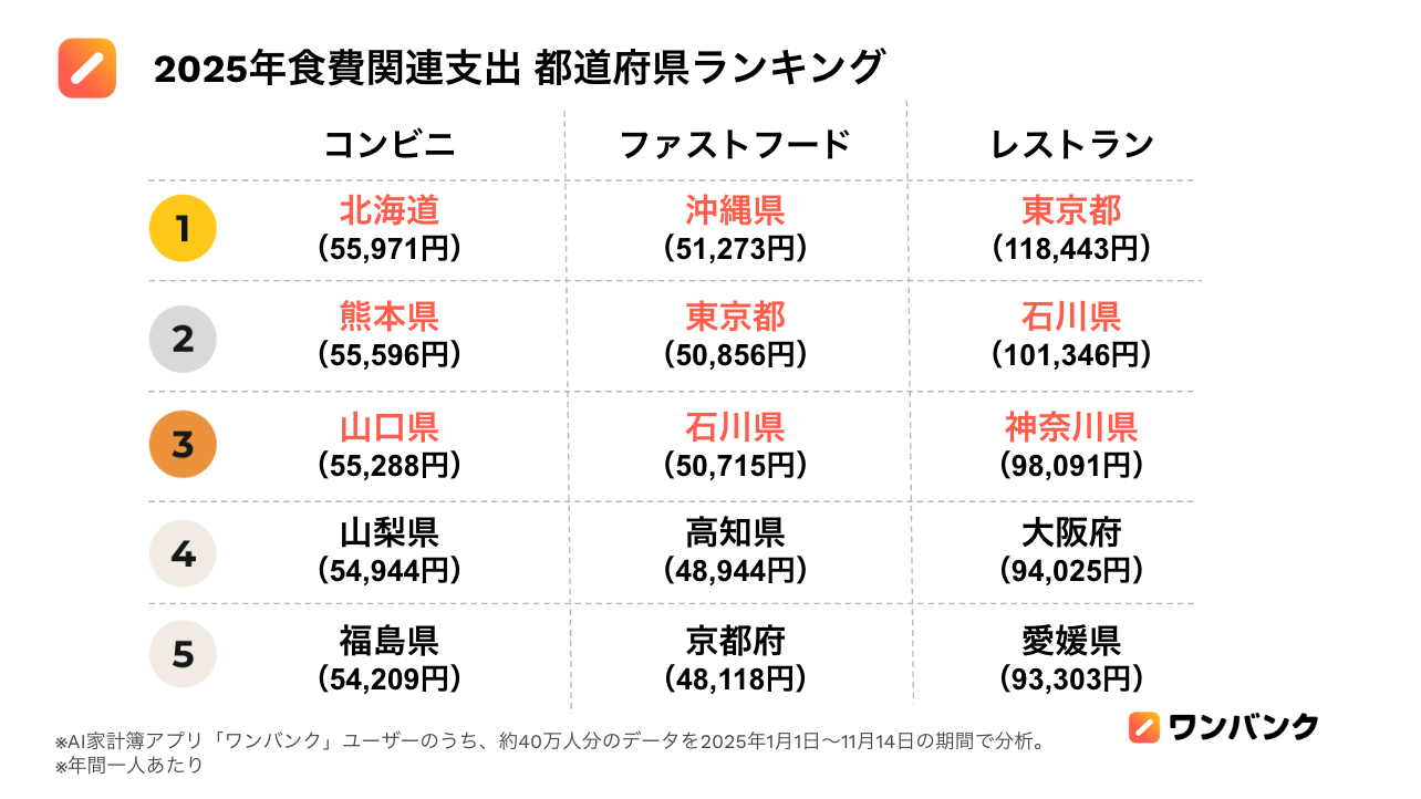 「ワンバンク」の家計簿データで、年間一人あたりの食費関連支出を都道府県ごとに見ると、コンビニでは「北海道(55,971円)」、ファストフードでは「沖縄県(51,273円)」、レストランでは「東京都(118,443円)」がそれぞれ1位という結果になりました。